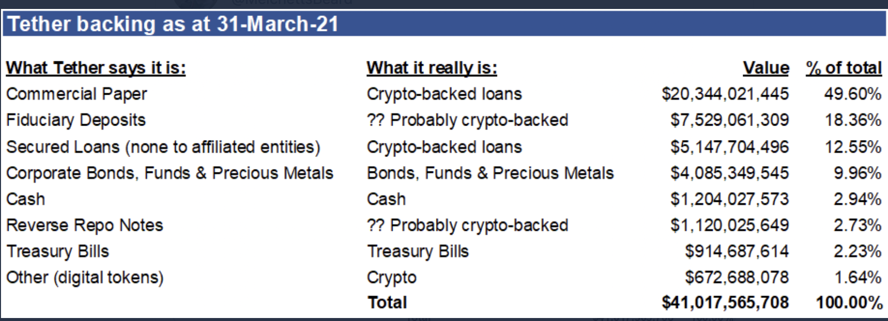 Patrick: If I can jump in here. Assuming, arguendo, that Tether is fully backed, Tether has said a few definitions over the years as to what constitutes backing. Under which definition do we believe that they are fully backed? What is the collateral? Where is it?